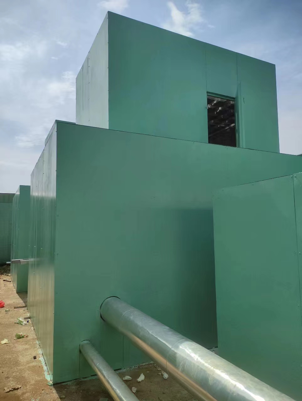 隔聲罩外殼通常由一層不透氣的具有一定重量和剛性的金屬材料制成,一般用2~3mm厚的鋼,鋪上一層阻尼層,附加阻尼層是為了避免發(fā)生板的吻合效應和板的低頻共振。要求高的隔聲罩可做成雙層殼, 內(nèi)層較外層薄一些,兩層的間距一般是6~10cm,空腔填充多孔吸聲材料,罩的內(nèi)側(cè)附加吸音材料,以吸收減弱聲音往外傳播的能量。在罩和機器、罩和基礎之間,通常鋪設減震墊,以防止振動的傳輸。對于需要散熱的設備,應在隔聲罩上留有必要的通風口,風口加裝消聲器或消聲百葉。